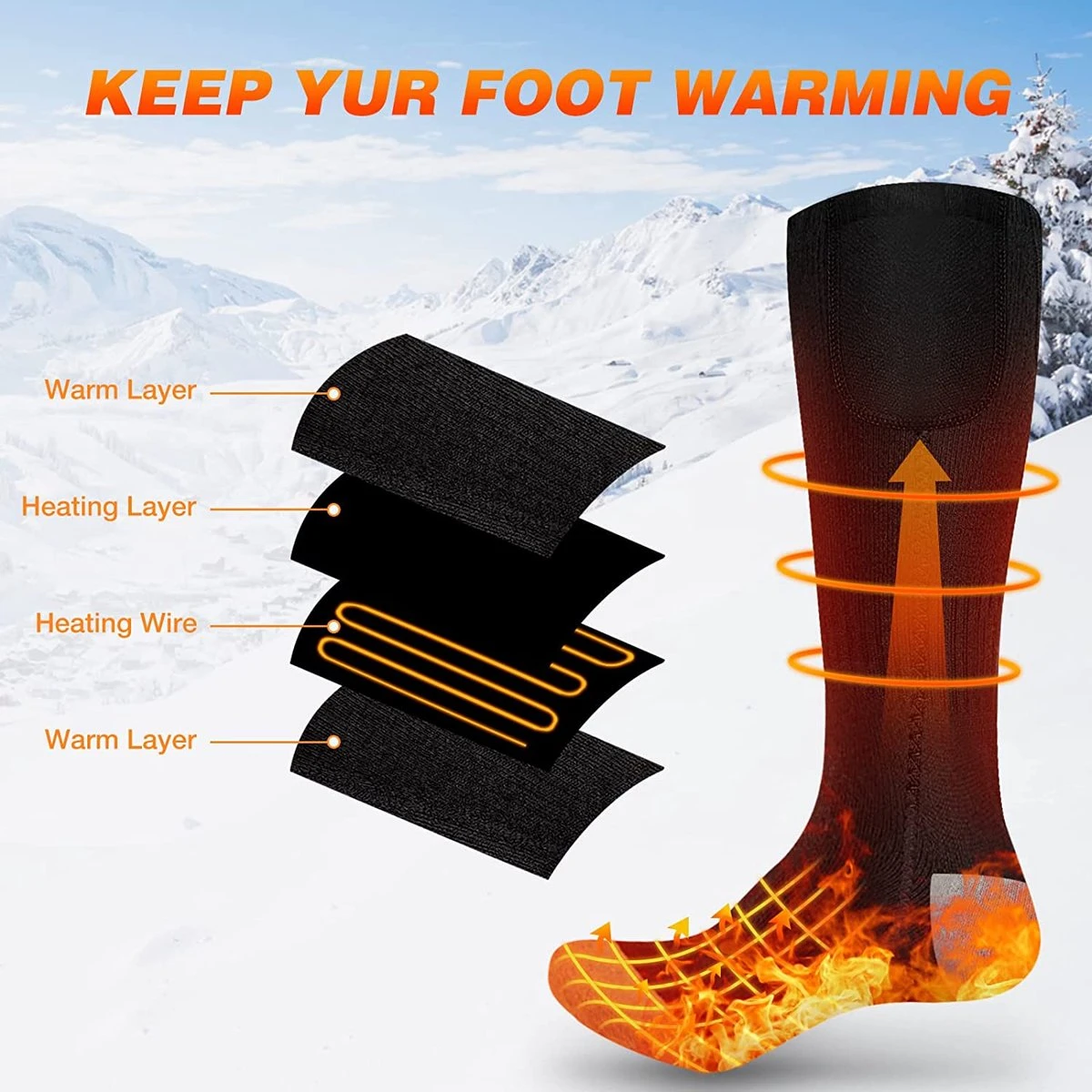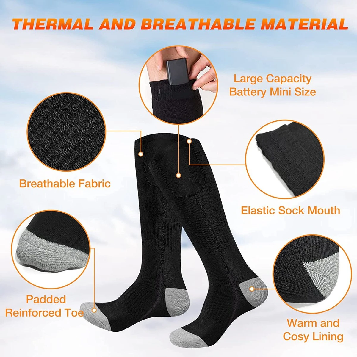 De sokken worden van stroom voorzien door de draagbare 4000 mAh powerbank en is eenvoudig op te laden via de meegeleverde USB-oplaadkabel. Dankzij het hoge accuvermogen kan de sokken tot 6 uur worden gebruikt op het laagste warmteniveau (30%), 4 uur op middelhoog warmteniveau (60%) en 2 uur op het hoogste niveau (100%).